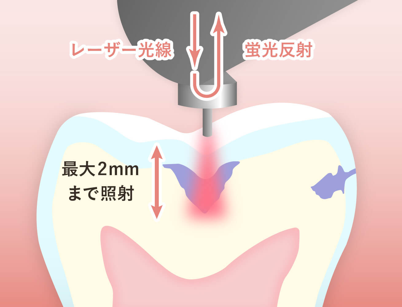 プローブから出たレーザー光は、測定しにくい隣接面や小窩裂溝部のカリエスの歯面から約2mmの深度まで到達し、カリエスに含まれる代謝産物(ポルフィリン)である蛍光反射を読み取り、数値化します。