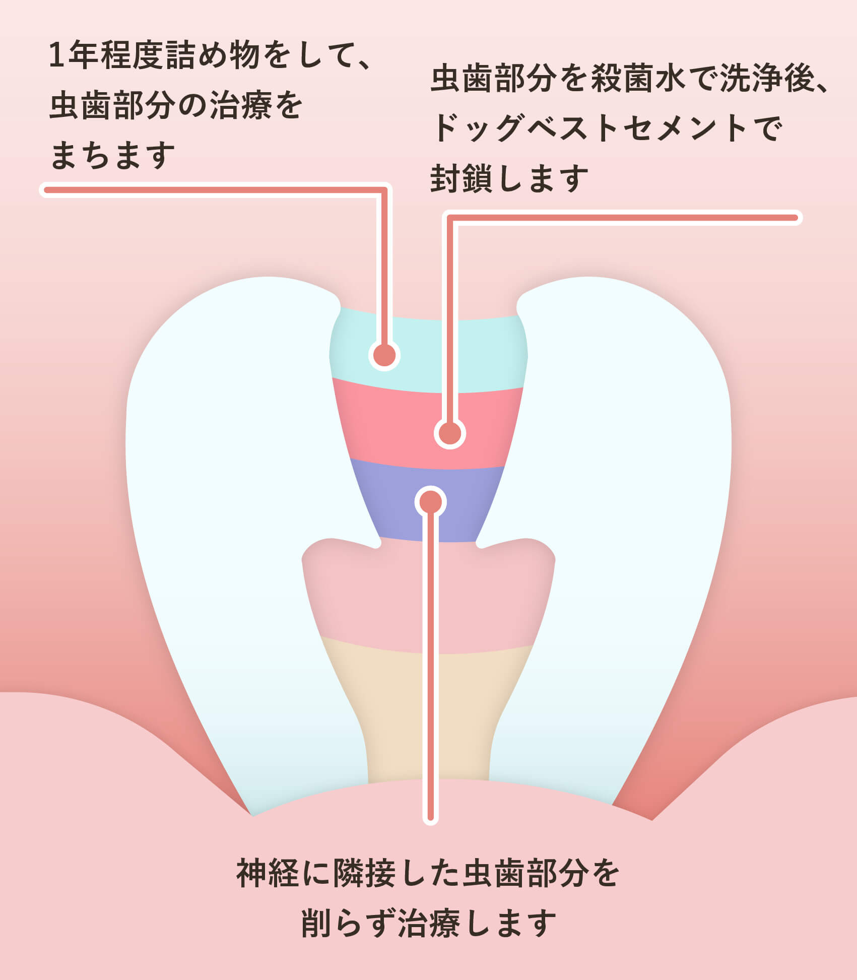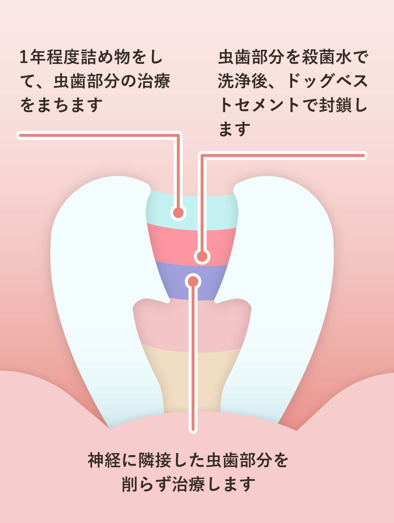 神経に接した虫歯部分を削らないで、ドックセメントで蓋をし、無菌状態にして虫歯部分の治療を待ちます。
